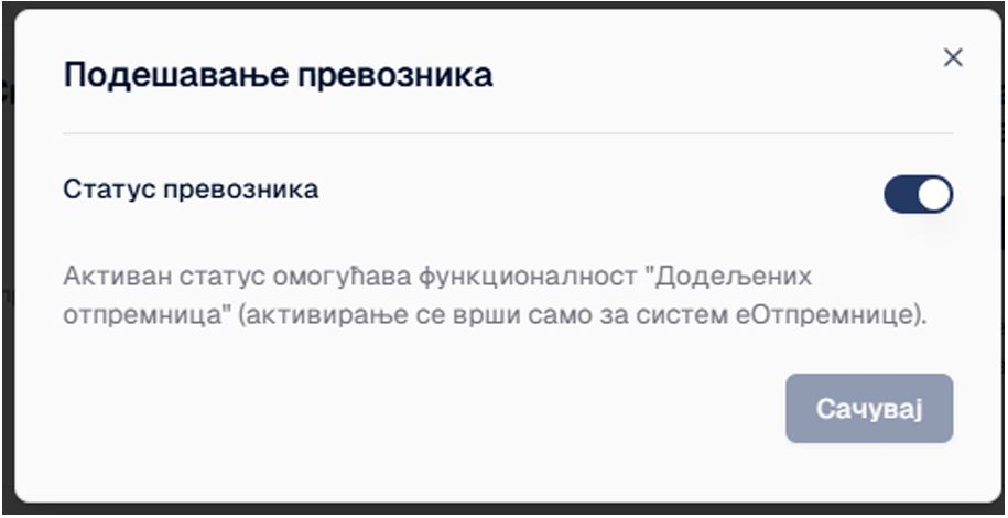 - Подешавања превозника су издвојена као посебна картица, са одговараућим описом да се активирање врши само за систем еОтпремнице.