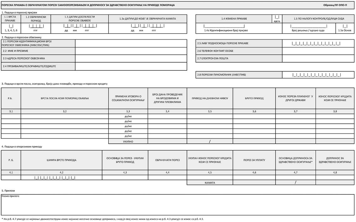 Образац ПП ОПО-П – Пореска пријава о обрачунатом порезу самоопорезивањем и доприносу за здравствено осигурање на приходе помораца одштампан је уз овај правилник и чини његов саставни део.